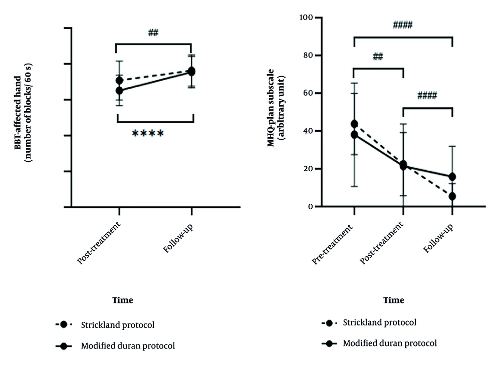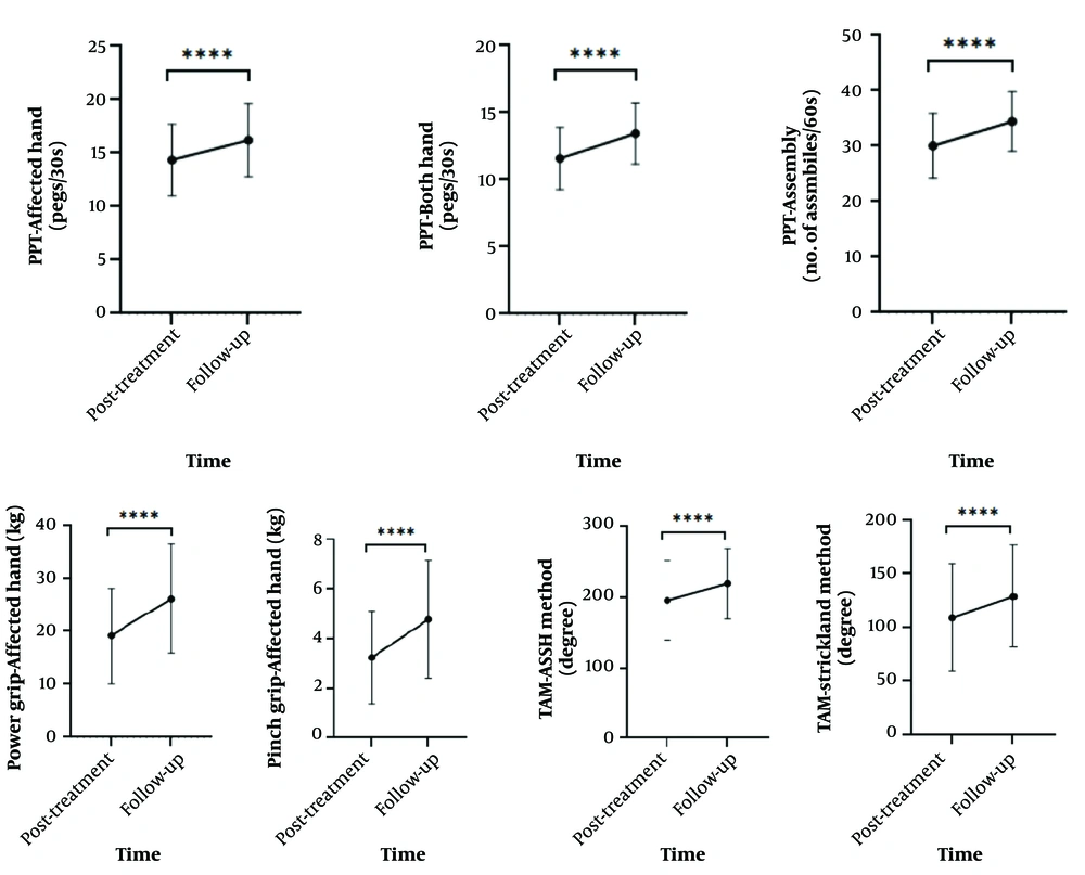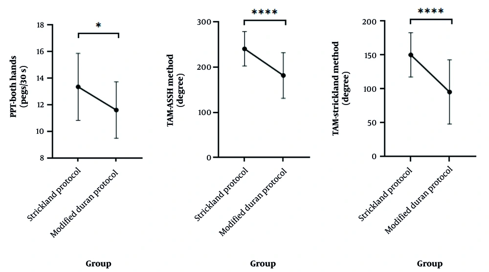 Comparisons between the two groups in secondary outcomes are represented in Table 3, followed by detailed explanations and corresponding figures. The hand dexterity level (P = 0.03) and ROM (P < 0.001) were significantly different between groups based on the results of PPT (both-hand subscale) and TAM (ASSH and Strickland methods) (Figure 2). Multiple comparison results of both BBT and PPT showed improvement in dexterity in both groups at follow-up (week 14) compared to after therapy (week 8). No significant differences were observed between the groups in these tests after therapy or at follow-up. Multiple comparison results showed an increase in power grip and pinch, as well as TAM, in both groups at follow-up compared to after therapy. However, the difference between groups was not significant at either time point.