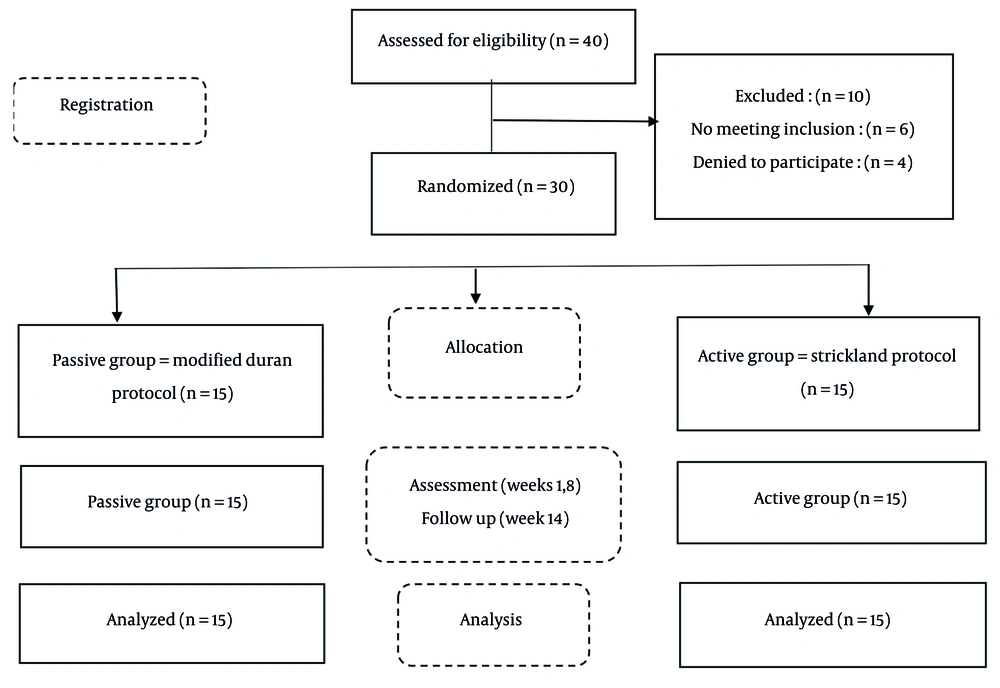 Based on the acceptable sample size for pilot RCT studies, which suggests a range of 10 to 75 participants per group, this study allocated 15 participants to each group (n = 30) (20). All participants signed a consent form before starting treatment. Although necessary explanations about therapy sessions and exercises were discussed with the patients, all study participants were blind to the treatment protocols, and therapy sessions took place on different days to avoid unmasking.