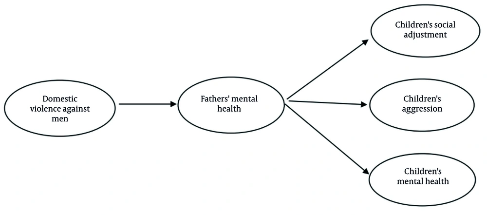 Domestic violence against men has emerged as a significant concern within the family environment in recent years (1). This form of domestic violence does not have a clear and distinct definition compared to violence against women; it encompasses any intentional mistreatment of a spouse, which includes sexual abuse (any form of unusual and abusive sexual relations), emotional abuse (acts of mistreatment and humiliation towards a spouse), and physical abuse (hitting and causing harm to a spouse) (2, 3). Regarding the prevalence of domestic violence against men in Iran, there is insufficient data; however, it appears to be quite common. A study conducted in the city of Mashhad, which examined 394 men, found that approximately 25% of participants reported experiencing moderate to severe domestic violence, with the most frequently reported form being psychological abuse (4). Notably, the prevalence of this type of violence has been observed to be higher compared to domestic violence against women (1, 2, 5). Due to the complexity and multifaceted nature of domestic violence, various psychological explanations have been proposed. The most significant of these include a spouse’s desire to control and dominate the other, the presence of anger and dissatisfaction, deficiencies in emotional management skills, and a lack of mutual understanding and empathy (1, 6). Domestic violence against men can have detrimental effects on their mental and physical health (7). Impaired mental health means that these men not only experience emotions such as anxiety (ANX), depression (DEP), and stress more intensely than others, but the increased anger and violence stemming from domestic violence can lead to a heightened risk of sexual conflicts and violent behavior in other relationships (8). Additionally, past studies have observed an increased risk of physical ailments (such as respiratory issues, muscular pain, and a higher likelihood of cardiovascular diseases) and psychological issues (self-harming behaviors such as suicide and substance abuse), as well as a decrease in quality of life among men who experience domestic violence (9-11), which can adversely affect spousal and family relationships. One of the negative consequences is its impact on children’s attitudes and behaviors. In other words, low mental health in fathers can significantly affect their children’s social adjustment, mental health, and increase the prevalence of aggression among them (8, 12). Despite various past studies, information regarding the underlying mechanisms of the impact of domestic violence against men on social adjustment, mental health, and aggression in their children remains unclear. In this context, a conceptual model was developed and illustrated based on a review of the literature (Figure 1).