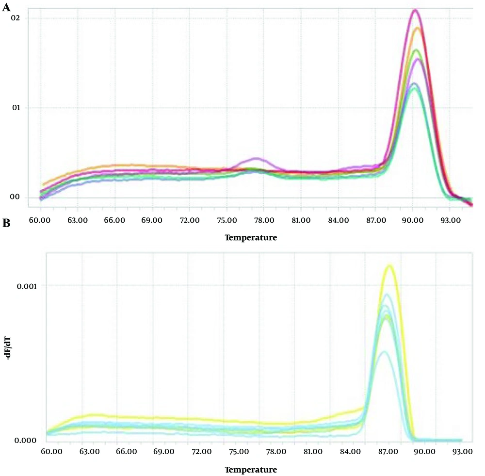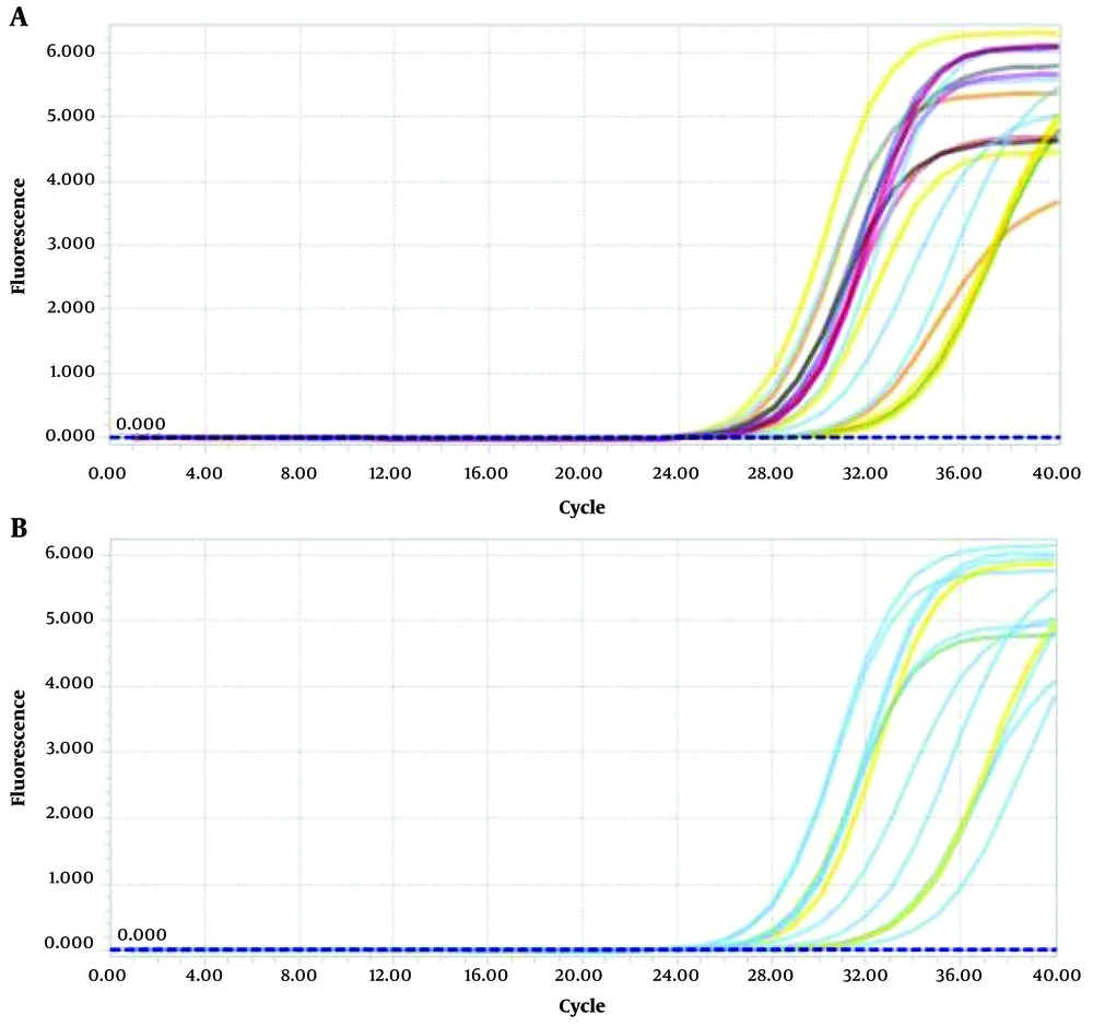 Expression changes were assessed using RT-PCR with the SYBR-Green kit (Takara Bio; Japan). A master mix including nuclease-free water, primer mix, and SYBR-Green was prepared, and 18 µL was aliquoted per reaction. Following the addition of 2 µL of cDNA, the tubes were run under the following conditions: Initial enzyme activation at 95°C for 15 minutes, denaturation at 95°C for 15 seconds, annealing at 60°C for 30 seconds, and extension at 72°C for 20 seconds (Table 1). Specific amplification and absence of primer-dimers were confirmed by analyzing melting curves and electrophoresis on 2% agarose gel.
