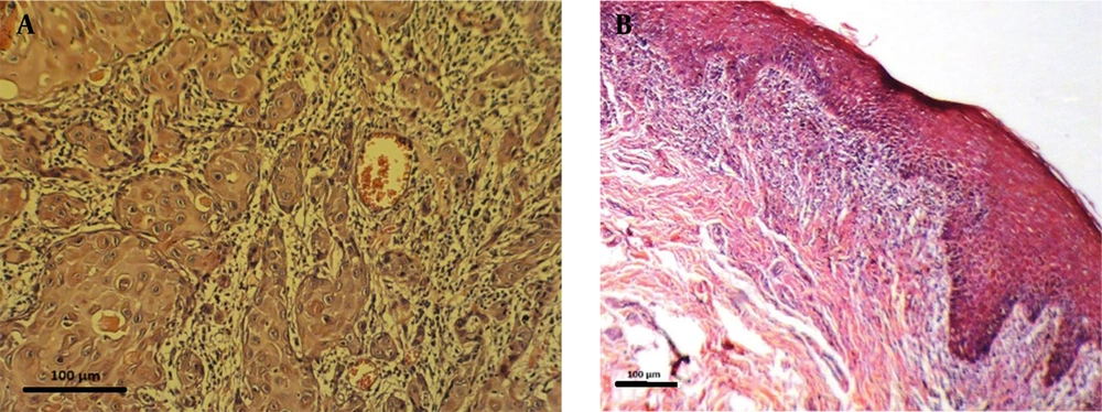 In this study, miRNA 146a expression was measured in 30 OSCC samples and 18 OLP tissue samples. Demographic and clinical variables such as patient age, sex, lesion location, and disease duration were not available due to the retrospective nature of the study and limitations in archived pathology records. The absence of these data introduces potential confounding variables that may influence miRNA expression, such as differences in age-related gene regulation, hormonal influences, anatomical variation, or disease chronicity. Figure 2 shows representative histopathological images of OSCC and OLP tissues, with scale bars and annotations included.