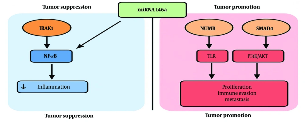 The miRNA 146a is biologically significant because of its dual regulatory function (Figure 1). It is involved in inflammation-driven carcinogenesis via NF-κB signaling, PI3K/AKT, and Toll-like receptor (TLR) pathways, and it modulates mediators such as interleukin-1 receptor-associated kinase 1 (IRAK1) and TNF receptor-associated factor 6 (TRAF6) (28-30). Several studies have reported elevated miRNA 146a expression in OSCC compared to premalignant and normal tissues, suggesting its potential as a discriminatory marker (31). Unlike other oncogenic miRNAs, such as miR-21 and miR-31, which primarily promote proliferation and invasion, miRNA 146a also impacts immune regulatory networks, making it a relevant target for mechanistic exploration (29, 31).