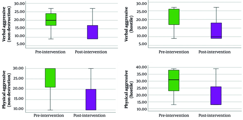 The rehabilitation program led to significant reductions across all types of aggressive behavior among patients with SUD. Verbal aggression (non-destructive) scores decreased from 20.02 ± 5.65 to 13.78 ± 6.18 (t = 10.503, P < 0.001, d = 1.165). Verbal aggressive (hostile) scores dropped from 21.30 ± 6.40 to 13.50 ± 5.86 (t = 9.505, P < 0.001, d = 1.501). Physical aggression (non-destructive) scores declined from 25.58 ± 6.53 to 14.80 ± 6.47 (t = 12.805, P < 0.001, d = 1.681). Physical aggressive (hostile) scores improved from 29.20 ± 9.09 to 19.51 ± 8.61 (t = 11.591, P < 0.001, d = 1.627; Appendix 4 in Supplementary File). Figure 1 provides a clear visualization of the intervention's impact, showing a consistent reduction in both verbal and physical aggression domains among patients with SUDs (Table 3).