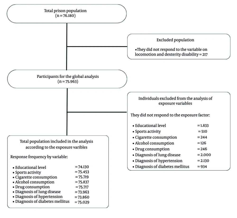 The first national penitentiary population census of 2016 recorded a total of 76,180 participants. For this study, individuals who did not respond to the outcome variable representing locomotion and dexterity disability were excluded (n = 217). As a result, 75,963 inmates were included in the final population analyzed in the study (Figure 1).