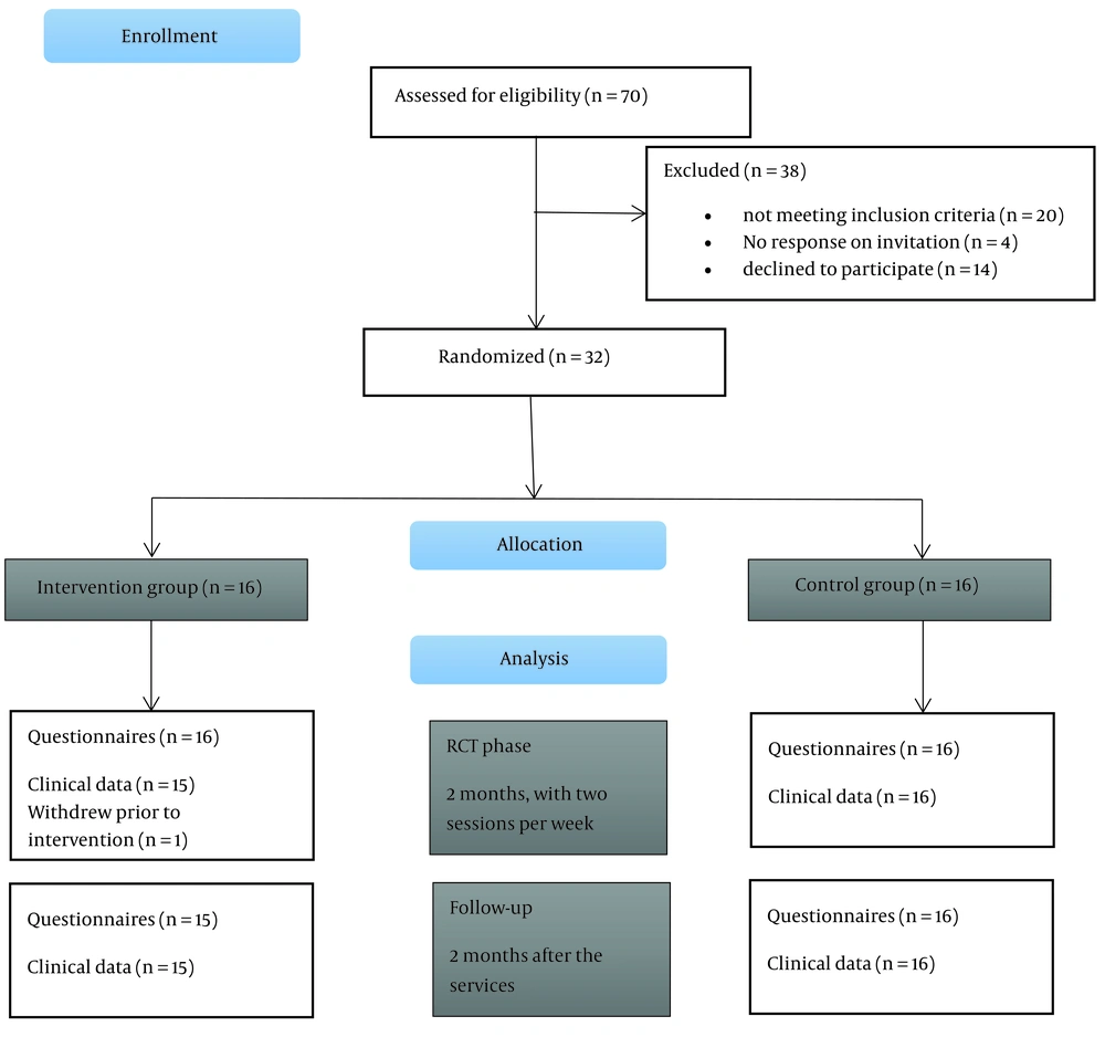 Severe mental illnesses (SMI) — including schizophrenia, schizoaffective disorder, and severe mood disorders — are among the leading causes of disability worldwide, profoundly impairing quality of life, increasing mortality risk, and imposing substantial economic and healthcare burdens (1, 2). In Iran, a nationally representative survey reported a 12-month prevalence of 21.3% for any psychiatric disorder among adults (3). Beyond clinical symptoms, individuals with SMI often face pervasive social exclusion, diminished self-identity, limited employment opportunities, and disrupted interpersonal relationships — factors that collectively hinder recovery and community integration (4-6). A core challenge in the recovery process is the lack of meaningful occupational engagement. Individuals with SMI typically spend less time in social, recreational, and vocational roles and report reduced capacity to derive pleasure from daily activities (7, 8). While qualitative and mixed-methods studies underscore that participation in purposeful activities — not merely the type or structure of occupation — is critical for mental health optimization (9, 10), traditional psychosocial services often fall short in fostering genuine autonomy and social belonging. Day centers, commonly used in Iran and other low- and middle-income countries, provide structured routines and social support but may inadvertently promote dependency by confining participants within institutionalized environments, thereby limiting their integration into broader community life (4, 11). In such settings, social networks often remain restricted to staff and clinicians, with minimal expansion into peer or community-based relationships (11, 12). In contrast, the clubhouse model — a non-clinical, member-driven, community-based approach — was developed specifically to address these limitations. Originating in the United States and now implemented globally, the clubhouse model emphasizes mutual support, shared responsibility, voluntary participation, and the right to meaningful work and social roles (13, 14). Unlike conventional day centers, clubhouses operate on the principle that individuals with SMI are “members,” not “patients,” and are actively involved in running the center’s daily operations. Systematic reviews and multiple controlled studies provide robust evidence for its effectiveness in high-income settings: A review by McKay et al. concluded that clubhouse participation is associated with significant improvements in quality of life, employment outcomes, and social functioning (15). Similarly, Bouvet et al. found that clubhouse members consistently report higher levels of subjective well-being and community integration compared to users of traditional day centers (16). Additional evidence from quasi-experimental and longitudinal studies further supports these findings (17, 18). However, these findings are largely derived from Western contexts, where clubhouse programs operate within well-resourced mental health systems and are often integrated with vocational and housing supports. In contrast, psychosocial services in Iran remain predominantly clinic-based, with day centers offering passive, staff-directed activities that may inadvertently reinforce dependency rather than autonomy (4, 11). Crucially, no randomized controlled trial has evaluated the clubhouse model in the Middle East or Persian-speaking populations, and existing studies in low- and middle-income countries are limited to qualitative case reports or non-controlled designs (15, 16). This gap is critical because the transferability of psychosocial interventions across cultural and systemic contexts cannot be assumed. The clubhouse model’s core principles — peer collaboration, shared responsibility, and voluntary membership — may interact differently with local values, family dynamics, and service structures in Iran. Therefore, rigorous, context-specific evidence is needed to determine whether the clubhouse model can be effectively adapted and implemented in Iranian mental health settings. To address this gap, the present study is the first pilot randomized controlled trial in Iran to examine the impact of a locally adapted clubhouse intervention on occupational engagement — a key mechanism of recovery — using validated, client-centered outcome measures (Canadian Occupational Performance Measure and the Profile of Occupational Engagement in people with Severe Mental Illness).