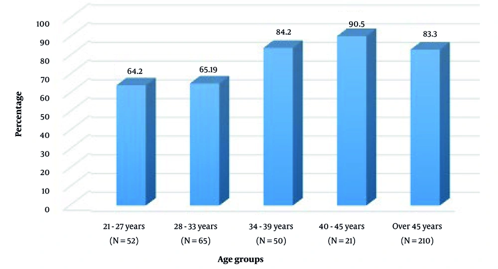 In our study, the frequency of low sexual function was calculated using the FSFI, a validated and reliable tool used to evaluate female sexual function in Iran and other countries (18). The frequency of low sexual function was 64.2% among women aged 21 - 27 years, 65.2% among those aged 28 - 33 years, 84.2% among those aged 34 - 39 years, and 90.5% among women aged 40 - 45 years. According to a meta-analysis of 11 studies involving 8,248 women conducted in Iran in 2016, the overall prevalence of FSD was 43.9% (95% CI: 35.0 - 52.8). Subgroup analysis based on Iranian cities showed wide variation in prevalence: 19.2% in Babol, 64.4% in Dezful, 45.2% in Sari, 64.0% in Tehran, 74.0% in Urmia, 46.2% in Ilam, and 31.5% in Bushehr (19). The frequency of low sexual function observed in our study was approximately twice as high as those reported in several previous Iranian surveys. This difference may be due to cultural attitudes toward sexuality, differences in sample characteristics, or the sensitivity of participants in self-reporting sexual issues.