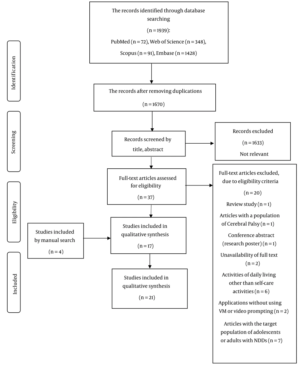 Neurodevelopmental disorders (NDDs) are complex conditions involving diverse disabilities (1). Sensory and cognitive deficits often impair self-care — eating, toileting, dressing — leading to caregiver reliance and increased parental and educator burden (2-5). A range of behavioral and instructional strategies has been used to teach self-care skills, including cognitive behavioral therapy, peer tutoring, pictorial schedules, applied behavior analysis, and video-based interventions (6-9). Among these, video modeling (VM) is particularly effective, grounded in Bandura’s social cognitive theory, which emphasizes learning through observation, imitation, and reinforcement (10, 11). This theory involves four processes: Attention, retention, motor reproduction, and motivation. The VM can capture attention, allow task repetition to support retention, segment activities to enhance motor performance, and serve as an internal motivator, with imitation followed by external reinforcement strengthening learning (11). Terminology in video-based instruction varies: The VM shows an individual performing the full target behavior; video prompting presents segmented clips for stepwise performance (12); and self-modeling features the learner performing the correct behavior (13). Clarifying these distinctions is essential for interpreting outcomes across NDD populations.