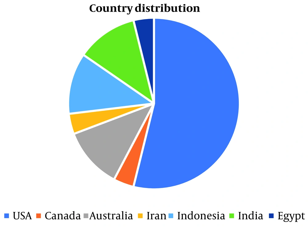 Over half of the studies [14 (66.7%)] were conducted in or after 2015 (10, 20, 22, 23, 36-45). Most [13 (61.9%)] originated from developed countries, mainly the United States [9 (42.9%)] (10, 19, 22, 23, 32, 35-37, 43) and Australia [3 (14.3%)] (21, 33, 34). The remaining studies were from Asian countries [7 (33.3%)] (20, 38, 39, 41, 42, 44, 45) and Egypt [1 (4.8%); Figure 2] (22, 40).
