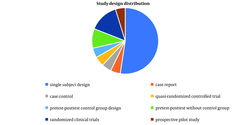 Most studies used a single-subject design [11 (52.4%)] (19, 21-23, 31, 32, 34, 35, 36, 39, 41). The rest included one case report (33), one case-control study (43), four quasi-experimental studies (10, 38, 42, 45), three randomized clinical trials (37, 40, 44), and one prospective pilot study (Figure 3) (20).