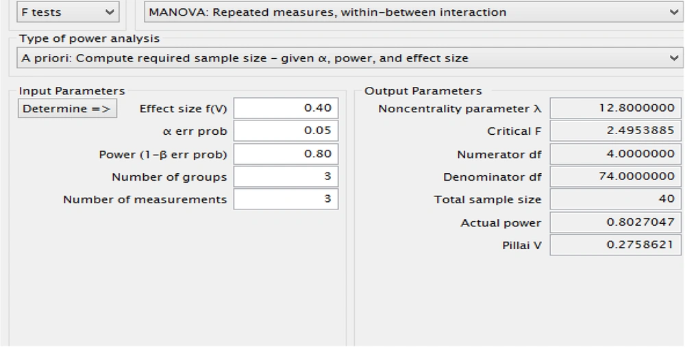 Before the intervention began, the subjects were given the necessary explanations about the purpose and title of the study. They were also given the necessary explanations about the intervention process, duration of the intervention, benefits of participating in the study, and maintaining confidentiality. Using G*Power and based on a previous study (20), the required sample size was calculated to be 40 participants, with an effect size of f = 0.40, a statistical power of 0.80, and a significance level of 0.05 (Figure 1).