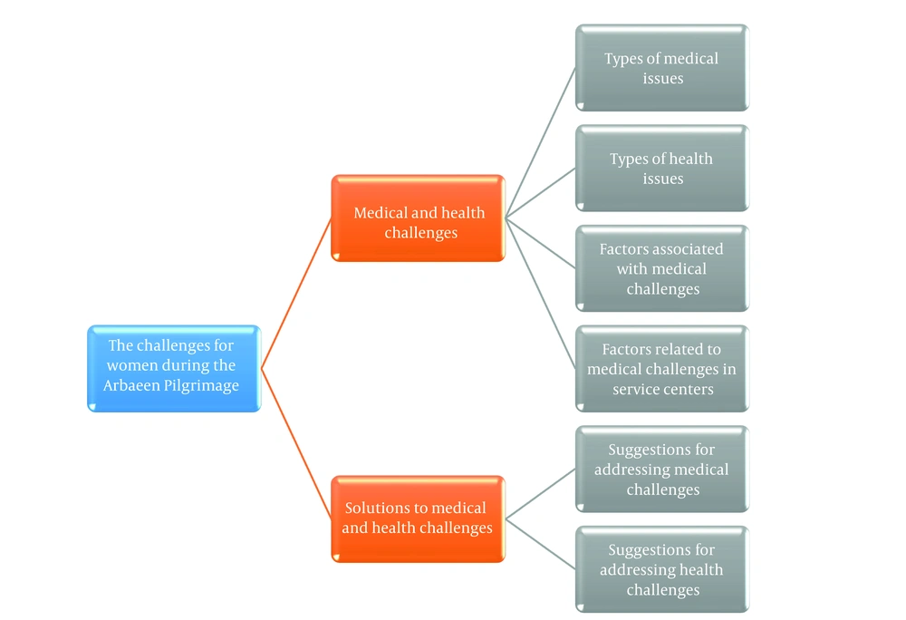 This qualitative study, using a content analysis approach, aimed to explore the medical challenges faced by women during the Arbaeen pilgrimage. The participants included 25 women aged 18 to 64 who had taken part in the pilgrimage. To ensure maximum diversity, factors such as education, age, number of Arbaeen pilgrimages, occupation, income, marital status, number of children, and social status were considered, with participants selected across all strata. Additionally, 12 healthcare providers — healthcare professionals including doctors, nurses, midwives, emergency medical staff, and obstetricians — with at least two years of relevant experience and prior participation in Arbaeen were included. Their contact details were obtained from Hajj and Pilgrimage Organization and Iranian Red Crescent Society.