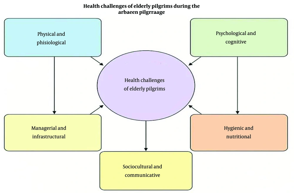 However, the involvement of older adults in the Arbaeen pilgrimage presents serious health challenges (8). Long walking distances, adverse environmental conditions, inadequate hygiene and medical services, and the absence of tailored support systems can jeopardize their physical and mental well-being (9). Moreover, the lack of comprehensive planning, infrastructural weaknesses, and insufficient training for volunteers and caregivers further increase their vulnerability (10). In such a context, a systematic and scientific examination of the health challenges faced by elderly pilgrims during Arbaeen becomes an urgent necessity (11).