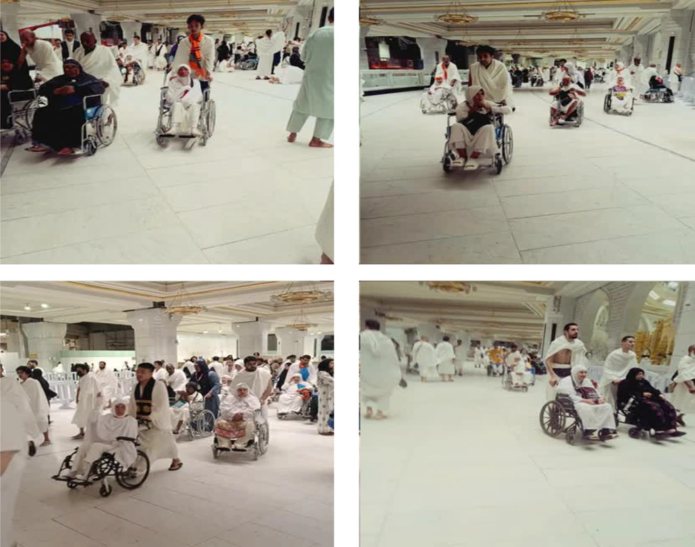 During rituals such as Tawaf and Sa’i, where thousands of people move simultaneously in confined circular or linear paths, controlling the speed and direction of wheelchair movement becomes extremely difficult (4, 5). The absence of designated pathways for wheelchair users, lack of warning signage, and insufficient training for caregivers or volunteers significantly increase the risk of wheelchairs striking the lower limbs of standing individuals (6). These collisions, especially in crowd densities exceeding critical thresholds (more than 5 persons per square meter), can result in physical injuries such as bruising, joint inflammation, or even fractures (7). Beyond physical harm, such incidents may also cause psychological effects including anxiety, fear of re-entering crowded zones, and disruption of the pilgrim’s spiritual experience (8).