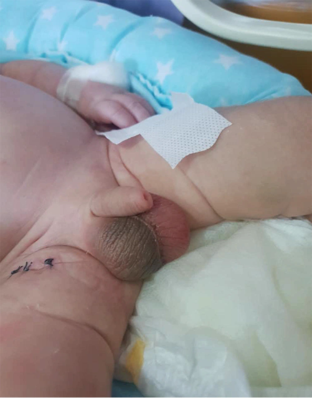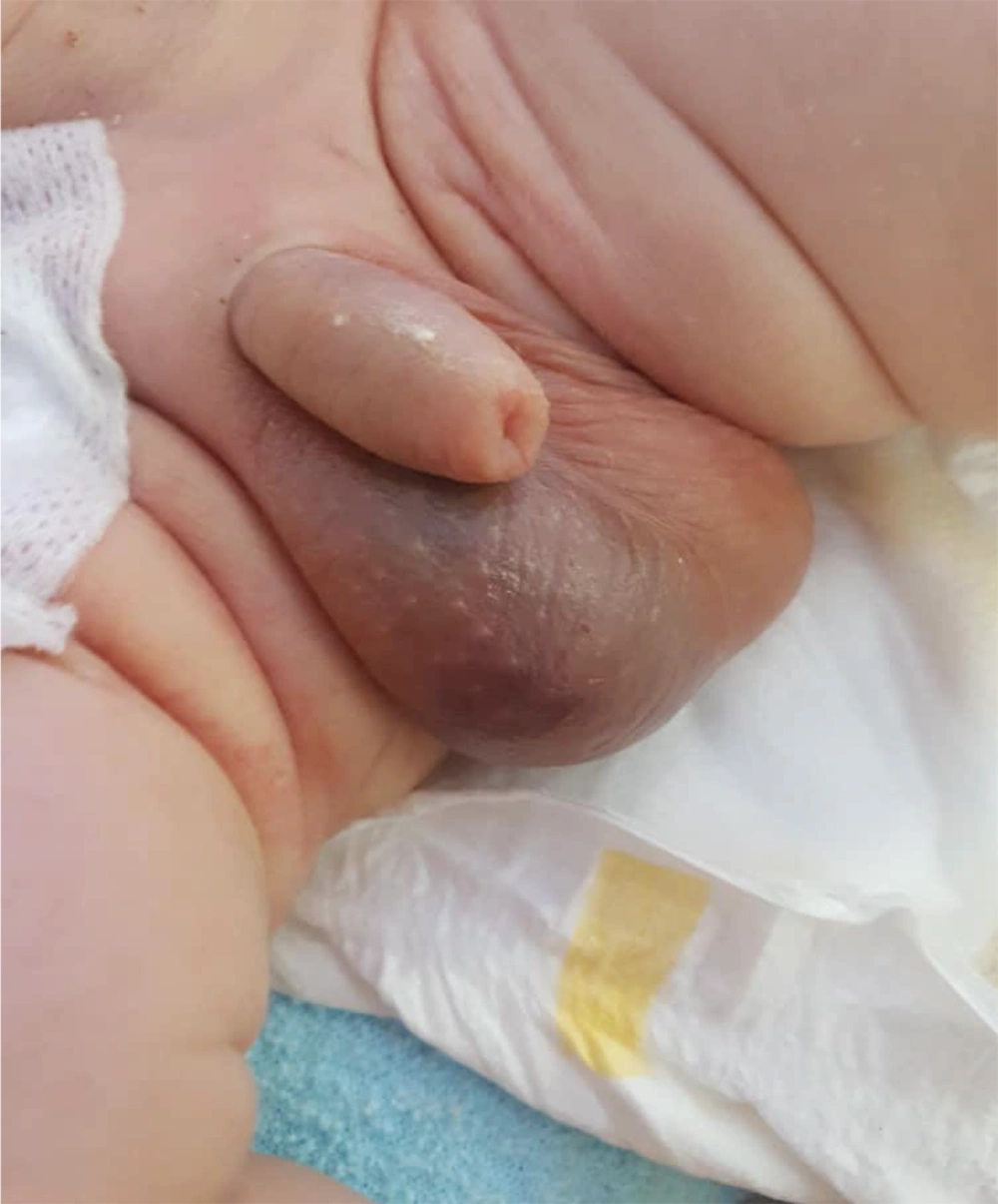 The neonate was under full observation for vital signs and health conditions. However, over the next 4 hours, right scrotal edema, discoloration, localized erythema, and clear fluid leakage from the right scrotum were observed during a diaper change (Figure 1).