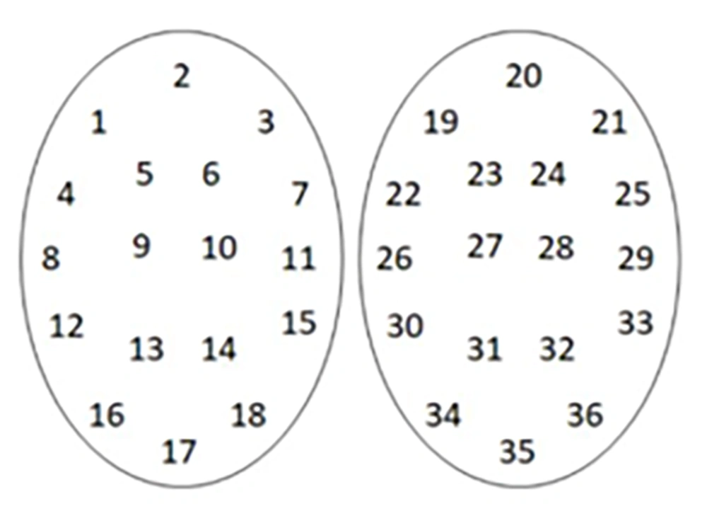 Laboratory results showed that the patient had azoospermia. Sperm analysis was done repeatedly and showed the same results. The patient had a normal FSH level and a negative Y-chromosome microdeletion (YCM). The patient elected to undergo sperm retrieval with PESA and TESE. Spermatozoa were found in several microscopic high-power fields. Hence, the samples were not able to be cryopreserved for future In Vitro Fertilization. The testicular biopsy showed that the Johnson Score was 7.0 for both testicles. The patient consented to a testicular mapping biopsy, during which non-motile spermatozoa were found in sites 3, 23, 26, 2, and 36 (Figure 4), with no adverse effects. Then, the patient was counseled for the possibility of hormone therapy prior to a targeted sperm extraction procedure 3 months after the testicular mapping biopsy to optimize results in the future. However, after 1 and a half years, the patient hadn’t returned to our clinic.
