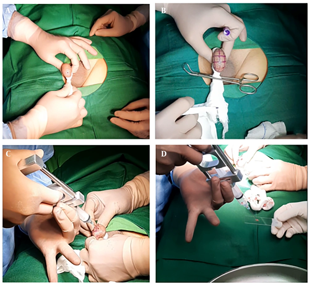 A, fixation of the testis using gauze; B, surgical site marking of the testis; C, cutting and sucking motion during biopsy; D, placement of biopsy tissue to object glass.