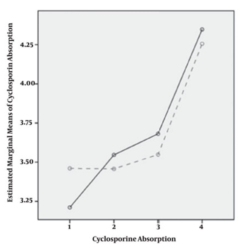 We found no gender difference among CsA absorption; which resembles with the previous finding (27). Roza et al. showed that awareness of the concerns that some patients might absorb CsA differently than others (28), potential differences between gender, ethnicity, and the presence of diabetes were not seen. They demonstrated that male and female kidney transplant recipients responded in the same manner (27). In addition, we found that age may significantly effect CA. Although some studies have shown that age of donor and recipient both are risk factors for acute and chronic rejection episode (29-32), other studies reported that in this group of patients, CsA level tend to be lower (31). however, Sugiyama et al. (32) demonstrated that pharmacodynamic parameters of immunosuppressive drugs did not correlate with age of renal transplant recipients (33). An experimental study on rabbits showed that renal impairment has an important effect on CsA blood levels (34). on the other hand, some other studies showed that CsA dose have linear relation to serum creatinine concentration (27, 33). It is assumed that the decrease in creatinine clearance can result in accumulation of CsA, especially in C2 level, and therefore CA increases during time (35).