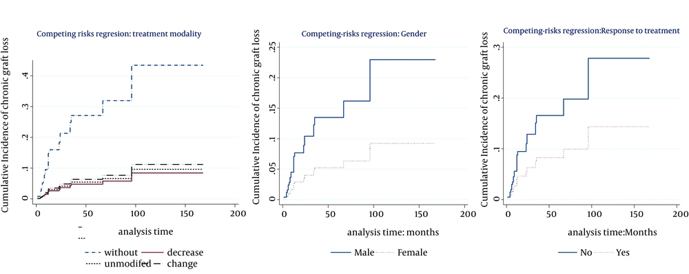 3. The incidences of chronic graft loss was higher in males and was lower in lower dosage of immunosuppressive drugs. It remained similar by regimen change, modification, or withdrawal of immunosuppressant. Response to the treatment decreased the incidence of this outcome. In addition, we showed in our univariate analysis that metastasis increased the cumulative incidence of chronic graft loss. Tiong et al. and Harada et al. showed in their studies that acute rejection episodes and any treated rejection episode (27), delayed graft function, black race, and recurrence of glomerular disease were independent risk factors of graft loss (28). Moreover, donor risk factors affecting long-term post-transplantation graft survival included age, small donor size with large recipient size, race, sex, cause of death, cold ischemia time, female donor gender, HLA mismatch, organs from expanded-criteria donors, and cytomegalovirus (CMV) status (25, 27). Briganti et al. showed that predictive factors of decreased 12-month graft survival on univariate analysis were older recipient age, presence of vascular disease in the recipient at the time of initiation of renal replacement therapy, higher peak panel reactive antibody levels, longer time on dialysis prior to transplantation, older donor age, cadaveric donor source, brain damage as the cause of donor death, greater number of human lymphocyte antigen (HLA) mismatch, longer cold ischemic time, and earlier year of transplantation (40).