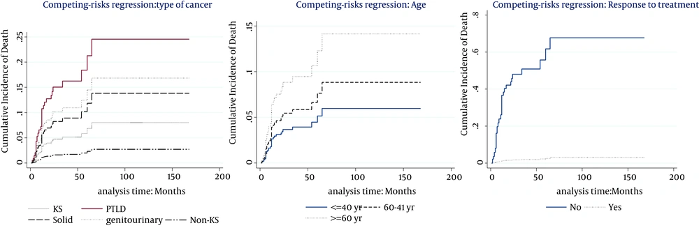 2. The incidence of death was higher in older patients, PTLD, and GU & RS tumor cases and hazard of death for Non-KS and solid cancers were similar to KS cancer. Response to the treatment decreased the incidence of death. Our estimates extended the findings of Mazuecos et al. and Einollahi et al. who reported that age and immunosuppressive treatment were related to cancer development (26, 30, 38) that increased mortality. Moreover, Alonso and Oliver showed in their study that post-transplant mortality was dependent on age in all recipients (39). We focused in our study on recipients with cancer. In addition, we showed in our univariate analysis that metastasis and treatment with AZA increased the cumulative incidence of post-transplant death.