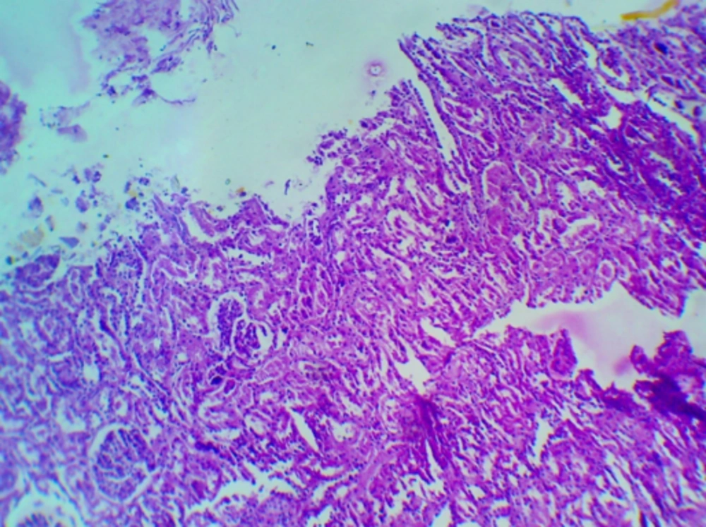 All patients with UPJO included in the study underwent open dismembered pyeloplasty and follow up DTPA renogram, which were done at the interval of 6 months and 12 months after surgical repair. During pyeloplasty, a small wedge of tissue, including full thickness cortical tissue from the lower pole of the affected kidney, was taken. All biopsy specimens were evaluated in a single laboratory using 5 µ section and H & E staining. Histopathological analysis was done by one pathologist who had no knowledge about the clinical status of any patient, to avoid bias. Histopathological changes found in renal tissue were graded in terms of presence of severity of tubular and/or glomerular changes into three groups: