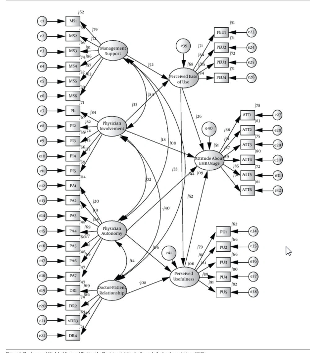 The poor direct association between “perceived ease of use” and “physicians’ attitudes towards EHR” in the present study was inconsistent with the theory of technology acceptance model (TAM). The mediating effects of “perceived ease of use” of a system cannot be ignored. However, it was the strongest predictor of usefulness in the TAM model (20). Although this association was part of the main study model, other findings, including those reported by Aldosari, showed that this association was poor (29). Chau and Hu (2002) also concluded that the physicians’ skill in the use of new equipments and technical systems was very high and that they were able to understand new things quickly (36).