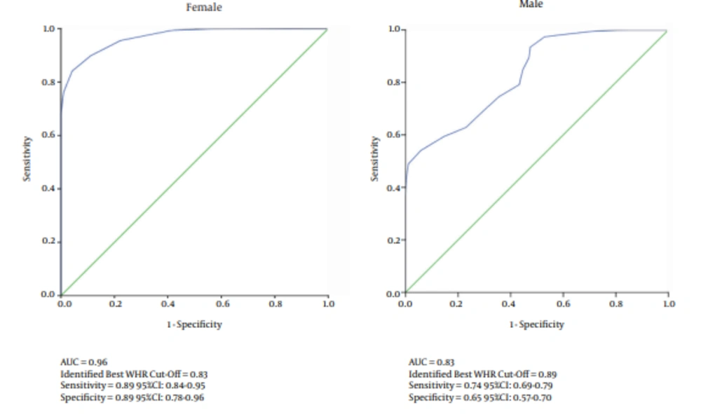 Mirmiran (30) estimated the range of the WHR cutoff points among Iranian adults in 3 age groups of 18 to 34, 35 to 54, and 55 to 74 years with at least 1 cardiovascular risk factor, as 0.86 to 0.94 and 0.78 to 0.90 for males and females, respectively. To compare the results with those of the current study, the participants were classified into the same age groups, and the obtained results were 0.84 to 0.95 and 0.82 to 0.86 for males and females, respectively. The findings showed the same range in males, but not females. The difference in females’ findings could have been due to the AUC difference. In Mirmiran’s study, the range of AUC for females was very low (0.59 to 0.65), but very high (0.98 to 0.99) in the current investigation. The larger AUC indicates higher accuracy (25); such results were not observed in males.