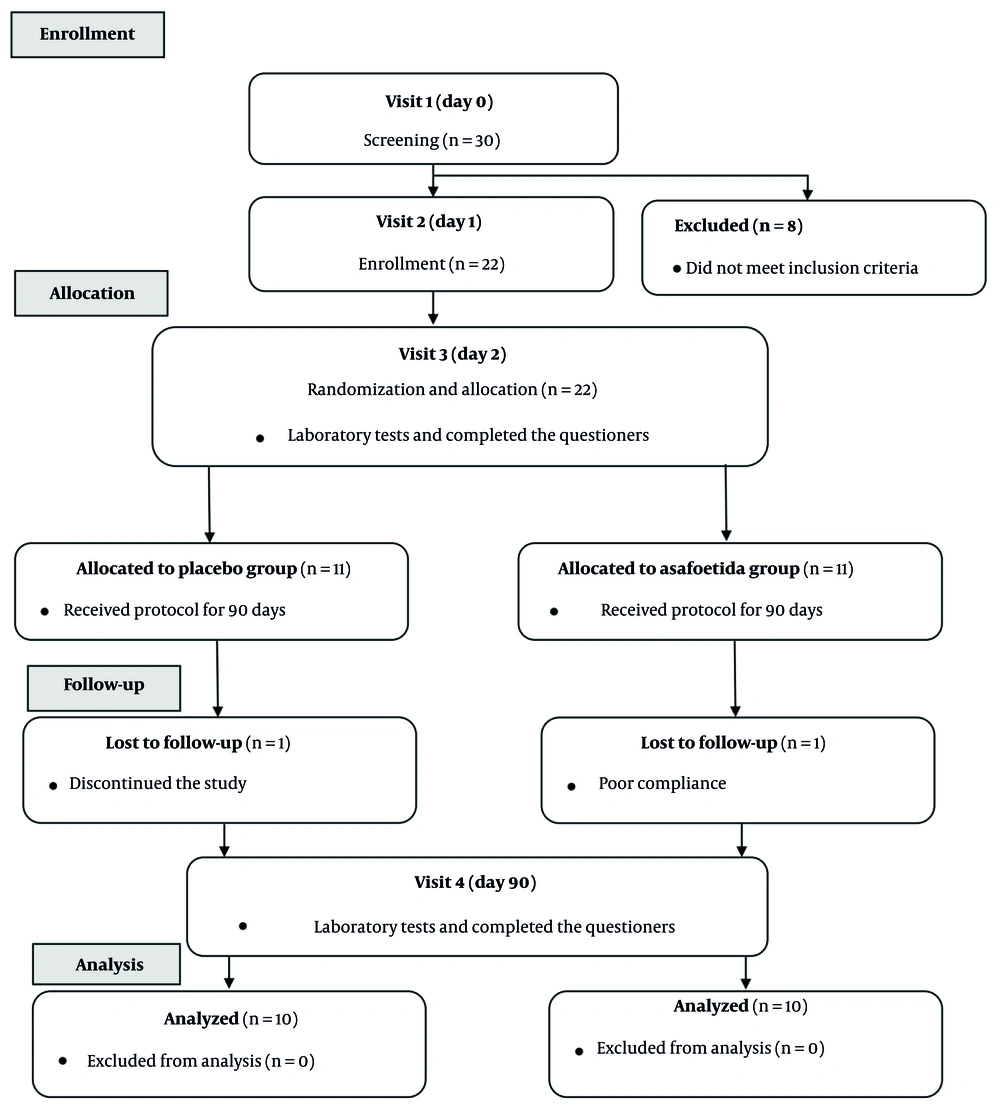 On the third visit (day 2), patients were divided into assa-foetida and Placebo groups. The intervention group received polyethylene containers containing 180 capsules labeled assa-foetida at a dose of 250 mg twice daily, and the control group received polyethylene containers containing 180 starch capsules at a dose of 250 mg twice daily as a placebo. Patients were instructed to take one capsule before breakfast and one capsule before dinner (250 mg twice daily) (10). At the end of the study, the compliance rate of prescriptions was assessed using the pill-counting strategy.