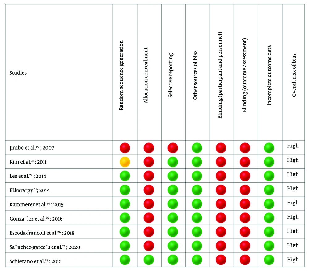 Several limitations temper these findings. All studies were assessed as having a high RoB using SYRCLE’s RoB tool, primarily due to inadequate reporting of randomization, blinding, and allocation concealment, which could inflate the reported benefits. For example, Jimbo et al. (2007) used only three mice, likely reducing statistical power and increasing variability (20). The use of animal models (mice and rabbits) limits direct applicability to humans, as differences in bone physiology and loading conditions may affect fibronectin’s effectiveness (33, 34). Furthermore, variability in implant types (e.g., titanium implants versus miniscrews) and assessment methods (e.g., histomorphometry versus scanning electron microscopy) introduces heterogeneity, complicating comparisons across studies. The short follow-up periods (up to 6 - 8 weeks) in these studies also leave long-term outcomes unclear. These findings highlight fibronectin’s potential to enhance implant surface bioactivity, particularly through chemotactic and adhesive mechanisms that promote osteogenesis. However, inconsistent results, as observed in Elkarargy (2014), suggest that factors such as implant surface characteristics or coating techniques may influence outcomes. Future research should focus on standardizing fibronectin application methods, increasing sample sizes to improve statistical power, and conducting human clinical trials to validate these preclinical findings. Long-term studies are also needed to evaluate the durability of fibronectin-enhanced osseointegration, ensuring its relevance for clinical dental implant applications.