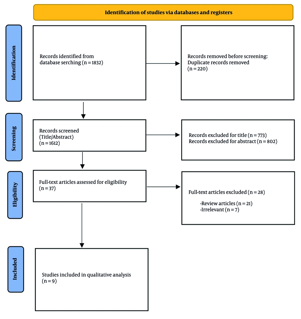 The search yielded 1,832 potentially-related titles. After removing duplicate articles, 1,612 articles remained. The titles of the remaining 1,612 articles were read; 773 were excluded due to irrelevant titles, leaving 839 articles. The abstracts of the remaining 839 articles were assessed, and 802 articles were excluded based on their abstracts. The full texts of 37 studies were obtained, and 28 studies were excluded, of which 21 were review articles. Nine articles were included in this systematic review, and their data were extracted (Table 1 and Figure 1). Nine animal studies were included, involving a total of 27 dogs, 63 rats, 6 minipigs, and 24 rabbits.