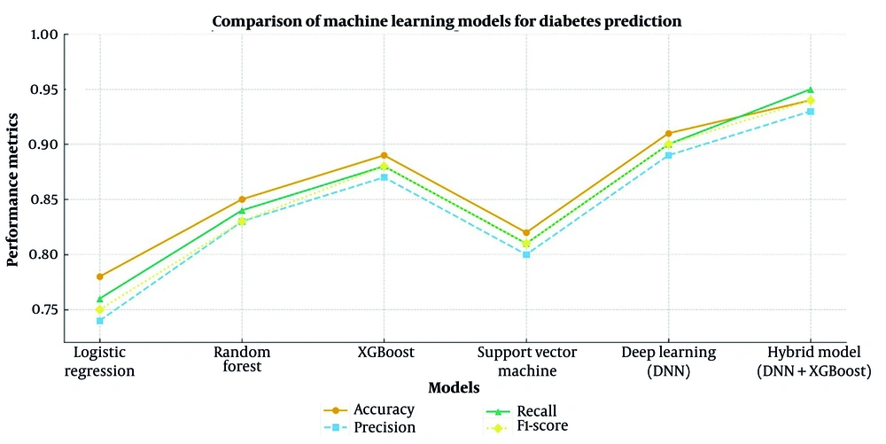 A comprehensive comparison was conducted on several ML models like LR, RF, XGBoost, SVM, DL, and the hybrid model. The models were selected based on their suitability in medical data analysis and their ability to address different complexities in diabetes prediction.