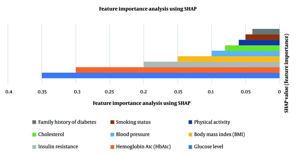Table 2 presents the key feature importance values in diabetes prediction. In Figure 3, the SHAP value shows the importance of each attribute in predicting diabetes. The greater the SHAP value, the greater the influence on the model's decision-making process. The blue bar (glucose level - 0.35) is the highest predictor, followed by the orange bar (HbA1c - 0.30), which has a high impact. The light gray bar (Insulin Resistance - 0.20) is another significant factor, but less than glucose and HbA1c. The remaining factors, such as BMI, blood pressure, and cholesterol (0.15 - 0.08), have a moderate impact. The brown and dark gray bars representing smoking status and family history of diabetes (~0.05) have the lowest impact. Therefore, highly influential SHAP value features are most predictive, and are glucose and HbA1c as the most significant factors, with family history and smoking status as less influential factors.
