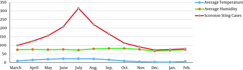 The unadjusted linear regression showed significant relationship between scorpion stings and some of the climatic factors, significant relationship among average, maximum, and minimum temperatures and average sunny days. Also, direct significant relationship was observed between the increase of temperature and the number of sunny days during the period of scorpion sting increase (P < 0.05).