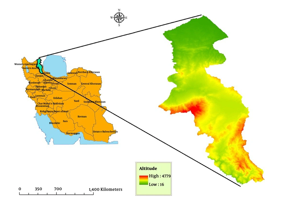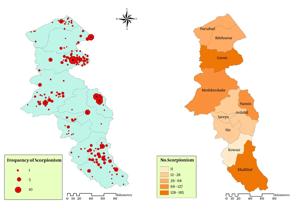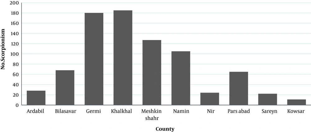 Annually, over one million scorpion stings occur in the world (1, 2). Scorpion sting is one of the health threatening problems and 36,000 cases are reported in Iran per year (3). Most of the scorpion sting victims are children. Approximately, the mortality due to the scorpion stings is annually more than 3250 cases in the world, and less than 20 human cases in Iran (4). Scorpion belongs to phylum Arthropoda and class Arachnida and to date 16 families of scorpions are identified worldwide (5, 6). There are three families of scorpions in Iran: Buthidae, Hemiscorpiidae, and Scorpionidae; 1500 species of scorpions are identified in the world of which 50 species are dangerous to humans (7); 23 genus and 44 species are identified in Iran. It is reported that most of the scorpions are scattered in Southern, and Southwestern areas of Iran, and the maximum variation of the scorpions are reported in Khuzestan Province with 19 out of 59 identified species (3, 8, 9). Four scorpion species are scattered in Azerbaijan regions, including Compsobuthus matthiesseni, Mesobuthus caucasicus, Orthochirus Scrobiculosus, and Scorpio maurus Linnaeus (1758) and in Ardabil regions two species were identified: Mesobuthus eupeus and Andrectonus crassicauda (10, 11). Scorpion sting occur in all regions of Iran. There is no complete definition of scorpion sting epidemiology and clinical signs in Iran (12, 13). However, the clinical symptoms of scorpion sting are different depending on the species: The amount of toxins entering the body, the season of the sting, and age and physical condition of the injured person (14, 15). Geographical information system (GIS) is a powerful tool for the epidemiological surveillance, management, and analysis of many health problems information (16). GIS can analyze the information and distribution rate of the disease in the spatial maps. GIS is very useful to manage, allocate resources, and monitor diseases in high-risk regions (17). The current study aimed at investigating scorpion stings, determining the distribution, and analyzing its spatial status in Ardabil Province to control, survey, and manage scorpion stings by GIS in the North-West of Iran.