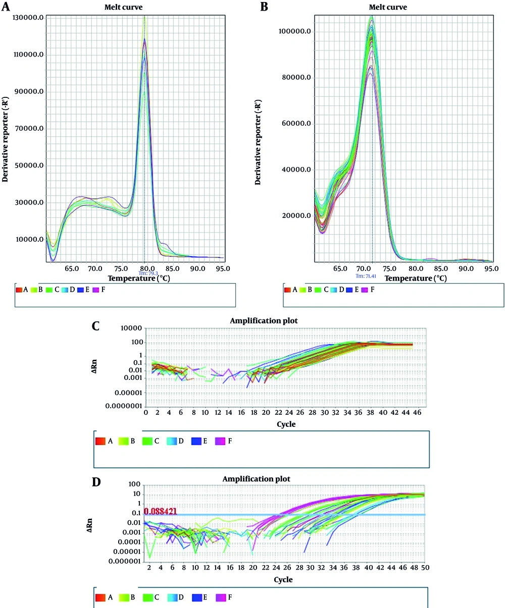 Real-time PCR results are displayed in Figure 1. Melt curve analysis was used to examine the results of amplification of specific fragments of miR-3173-3p and miR-4772-3p genes and possible formation of primer dimers. As shown in Figure 1A-B, both genes are specifically propagated. Figure 1C-D depicts the typical amplification plot obtained from SYBR green real-time PCR with glioblastoma cancer tissue. The horizontal line corresponds to the threshold, which is defined at the level of the highest amplification rate during the initial exponential phase.