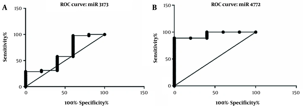 Biomarker evaluation of miR-3173-3p and miR-4772-3p was assessed using ROC curve, as shown in Figure 5A-B. The area under the curve shows the sensitivity and specificity in differentiating GBM patients from healthy individuals. The area under the curve of miR-3173-3p was 0.6311, and its significance level was 0.34 with CI = 0.3475 to 0.9147. The area under the curve for miR-4772-3p was 0.9556, and its significance level was 0.0009 with CI = 0.8921 to 1.019. Although the ROC curve evaluation of miR-3173-3p showed that the expression of this gene failed to differentiate between healthy and diseased groups, the ROC curve for miR-4772-3p expression could effectively differentiate between the patients and healthy controls (Figure 5A-B). Determination of cut-off value showed that miR-4772-3p, with cut-off of 0.6939, differentiated GBM patients from healthy individuals with 100.0 specificity and 88.89 sensitivity.