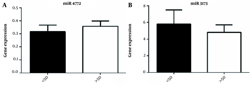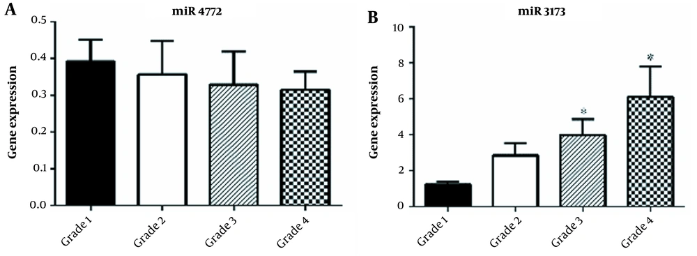 Analysis of the expression of miRNAs such as miR-4772-3p in the pathogenesis of sepsis suggests that they can be used as biomarkers for the diagnosis and prognosis of sepsis (23). Bioinformatics analysis in pancreatic cancer showed that miR-4772-3p with a downregulating mechanism had a great potential to be used as a prognostic factor and therapeutic target for this tumor (24). Also, in this study, the expression level of miR-4772-3pwas performed in comparison with normal tissues with Real-time PCR method on glioblastoma cancer tissues. We found that age and stage of the disease did not have a significant effect on the expression of this gene.