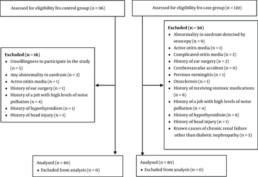 This case-control study was conducted during February to December 2013. Subjects in the case group were consecutively selected from the diabetics who referred for diabetic control to Golabchi and Naghavi diabetes centers in Kashan University of Medical Sciences. The inclusion criteria for the case group were a medical diagnosis of diabetes mellitus (based on the criteria of American diabetes association 2013), being under treatment with anti-diabetic medications or insulin, and an age between 20 to 50 years. The exclusion criteria were as follows: 1) existing excessive ear wax in the ear canal or any abnormality in the eardrum detected by otoscopy, 2) active otitis media, 3) complicated otitis media, 4) history of ear surgery, cerebrovascular accident, meningitis, otosclerosis, measles, mumps, and rubella, 5) history of receiving ototoxic medications (i.e. aminoglycosides), 6) history of having a job with high levels of noise pollution, 7) history of hypothyroidism (serum thyroid stimulating hormone (TSH) level more than 5 (U/mL)), 8) history of head injury, 9) known causes of chronic renal failure other than diabetic nephropathy.