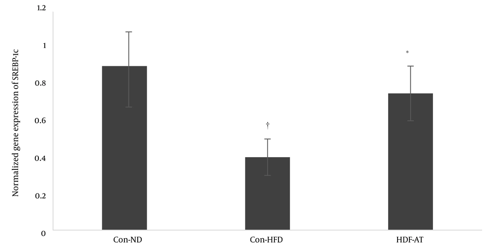 Obesity causes several metabolic disorders in skeletal muscles (1, 2), including insulin resistance resulting from disturbances in glucose uptake and metabolism (3). Obesity increases the absorption and storage of fatty acids and decreases lipolysis in the skeletal muscle, thereby disrupting the turnover of fats (4). On the other hand, the oxidation of fatty acids is slowed down in skeletal muscles due to obesity (5), possibly because of an increase in the activity of lipogenic enzymes and a decrease in the oxidation capacity of mitochondria (6). For this reason, in obese individuals, fatty acids tend to be stored in skeletal muscles instead of being oxidized (7). One of the important genes involved in lipid metabolism is sterol regulatory element binding protein (SREBP) (8). As a group of transcription factors attached to the cell membrane, SREBPs regulate the expression of the genes controlling the production and absorption of cholesterol, fatty acids, triglycerides, and phospholipids (9). Evidence shows that SREBPs are expressed in tissues with high lipogenic capacity, such as hepatocytes and adipocytes. In vitro and in vivo studies have shown that this gene is also expressed in a significant portion of skeletal muscles (10). SREBPs have three isoforms: SREBP-1a, SREBP-1c, and SREBP-2. Among these, SREBP-1c, as a transcription factor, regulates the expression of lipogenic genes, such as fatty acid synthase (FAS) and malonyl-CoA and acetyl-CoA carboxylase (ACC) (11). The expression of SREBP-1 in the skeletal muscle tissue is partly regulated by insulin, and its expression is reduced during insulin deficiency (12).
