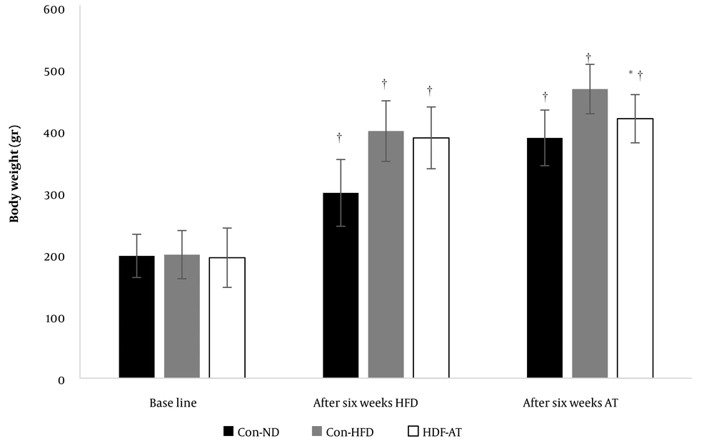 The Shapiro-Wilk test and Levene’s test affirmed the normality of data distribution and homogeneity of variances, respectively. The results showed that feeding with a high-fat diet significantly increased the weight of the animals (P = 0.001), and aerobic exercise resulted in significant weight loss (P = 0.001, Figure 1).