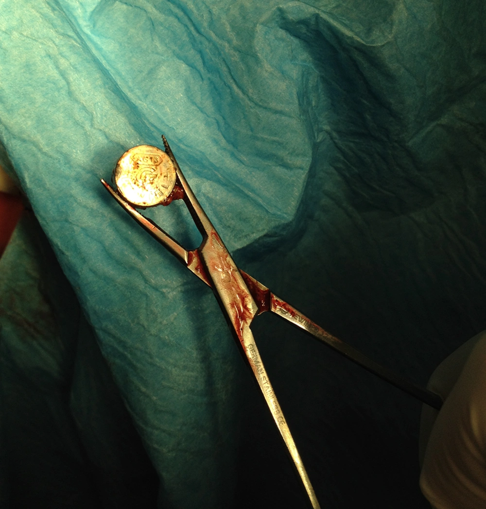 The patient was admitted for examination under general anesthesia. First we performed cystoscopy by a 6 Fr. cystoscope, but we did not find any bladder abnormalities. Furthermore, the vaginoscopy confirmed a round metal object embedded to the posterior fornix covered with necrotic tissue and surrounded by sever vaginal burn. Following vaginal irrigation by normal saline through the cystoscope the button battery was visible and the battery was pushed and fixed upward by a digital rectal maneuver in order to be grasped by Mosquito forceps and removed following installation of 5 mL of sterile lubricant gel by gentle traction (Figure 2). The object was a discolored 1 cm diameter battery. Repeated gentle vaginoscopy confirmed a type III coin shaped burn with no fistula to the rectum. The hymen was elastic and intact following removal of the foreign body. We finished the procedure following vaginal irrigation with diluted povidone-iodine solution and installation of gentamycin eye ointment into the vagina. Besides, we prescribed laxative (milk of magnesia) in order to facilitate a soft stool rectal passage. During her post-operative days she did not have fever or any systemic signs.
