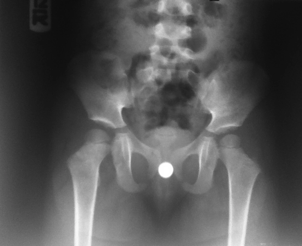 A three-year-old girl was referred to our pediatric urology clinic with chief complain of bloody discharge which increased by defecation, for more than one week. Her mother denied a history of any foreign body insertion or sexual abuse. She did not have any pruritis or voiding dysfunction. She did not take any medication. Also, her past medical and surgical histories were unremarkable. Vital signs were stable and she was afebrile at the time of admission. Chest and cardiovascular system examinations were normal. She had normal female external genitalia with no sign of erythema, skin inflammation or excoriation. Pelvic and urinary system sonography excluded any underlying pathologies such as malignancy. Pelvic X-ray revealed a round radio-opaque object in her pelvic cavity which was compatible with a button battery (Figure 1).