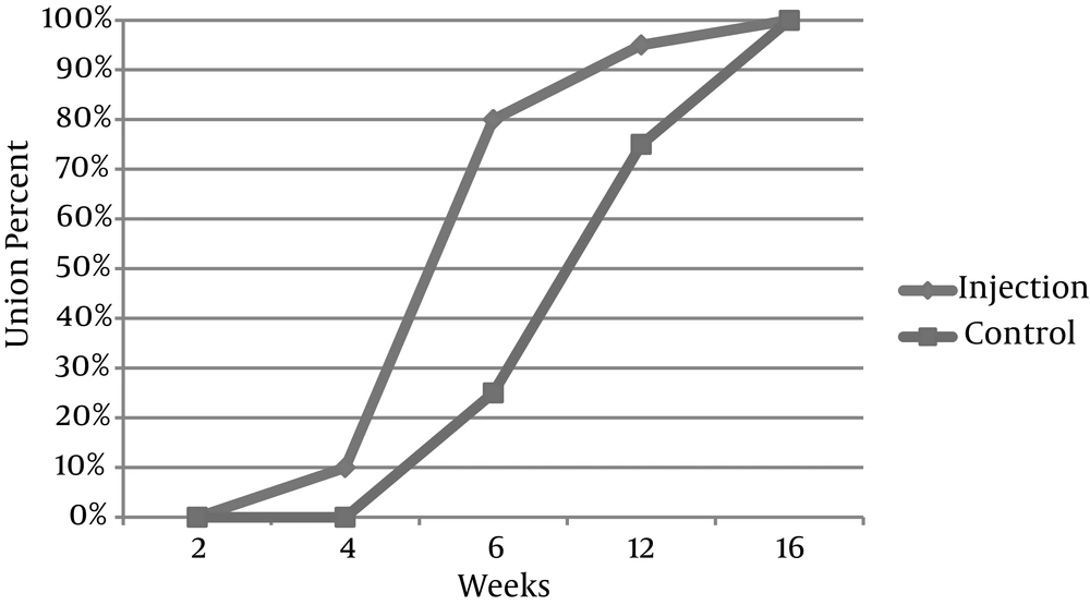 No changes were observed in the radiographs after two weeks. Two (10%) patients in the injection group showed bone callus formation after 4 weeks (P = 0.302). In the sixth week, 16 (80%) patients in the injection group and 4 (25%) individuals in the control group had radiographic changes (P = 0.001). Union changes were seen in 19 (95%) patients in the injection group and 12 (75%) patients in the control group at the end of the twelfth week (P = 0.108). All patients in both groups had complete union 16 weeks after their respective treatments (P = 0.31). On average, union took 7.04 ± 2.49 weeks for the injection group, while it took 10.41 ± 3.26 weeks in the control group. Patients in the injection group had a significantly faster union time compared to patients in the control group (P = 0.002).