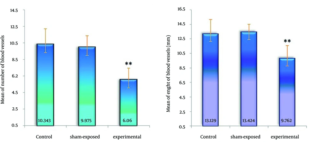 Comparing mean number of vessels (10.34±1.85) and length of vessels (13.12±2.04 mm) in the control group with the number of vessels (9.97±1.38) and length of vessels (13.42±1.08 mm) in sham-exposed group did not show any significant differences. There was a significant decrease in mean number of vessels (6.06±1.36) and length of vessels (9.76±1.21 mm) in experimental group (p<0.001). It is indicated shell extract of Chiton lamyi have anti angiogenesis effect on chorioallantoic membrane [Figure 2].