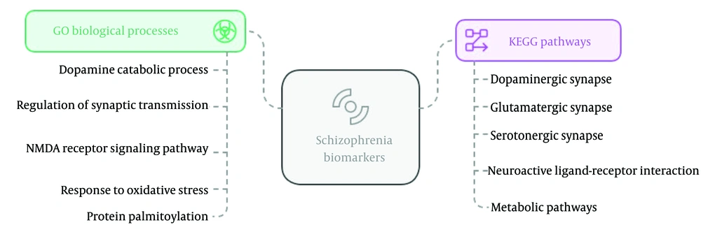 The PRODH gene, which encodes PRODH, is most highly expressed in bone. Proline oxidase deficiency is a disease linked to this gene, arising from a dysfunction in a redox cofactor (electron carrier) crucial for several key enzymatic reactions in metabolism. The ZDHHC8 gene, encoding ZDHHC8, is most highly expressed in plasma. It is associated with schizophrenia, with or without affective disorder, and its functional mechanisms may be relevant to the action of anti-Parkinson agents. Gene ontology (GO) biological process and KEGG pathway enrichment for top-ranked schizophrenia biomarkers are shown in Figure 2.