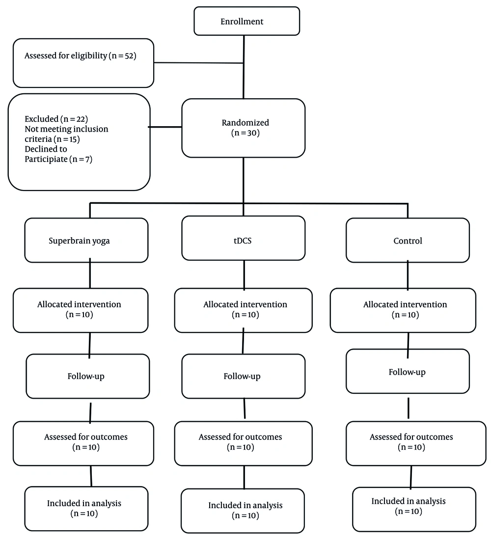 Participants were recruited through convenience sampling, using predefined inclusion and exclusion criteria. They were then randomly assigned to one of three groups (n = 10 each): Super brain yoga, tDCS, or a control group. The study's goal was to compare the independent effects of each intervention. A combined intervention group was not included, ensuring clear attribution of outcomes. Although past physical activity history was not a criterion, all participants were classified as physically inactive at baseline. Their initial activity levels were recorded to verify group comparability. Due to limited resources, a sham tDCS group was not included; this limitation is acknowledged.