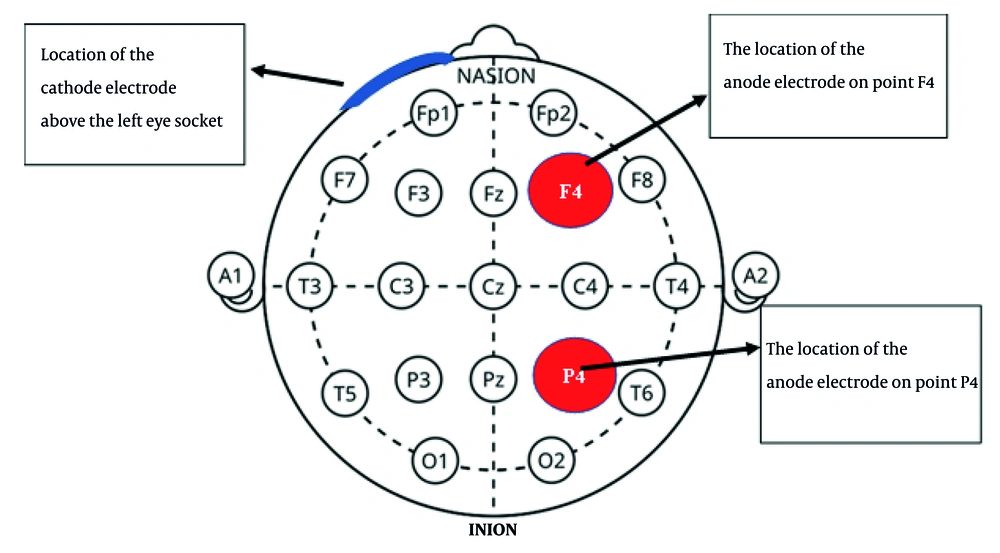 Brain stimulation was administered using the Neuristim Model 2 tDCS device, delivering a constant current of 1 mA through 3.5 × 3.5 cm saline-soaked sponge electrodes (17). The anodal electrode was placed over F4, corresponding to the right primary motor cortex (M1) of the dominant hemisphere, while the cathodal electrode was placed above the left supraorbital area (forehead), in accordance with the international 10 - 20 EEG system. This configuration produced a current density of 0.029 mA/cm2. All sessions were supervised; Electrode placement is illustrated in Figure 1 (18).