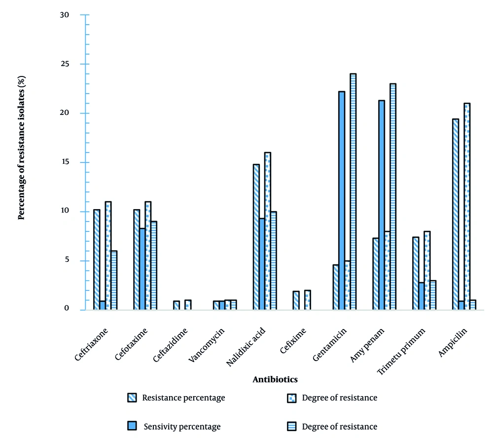 The highest resistance of E. coli was to ampicillin (19.4%) and the lowest resistance was to vancomycin (0.9%). The highest susceptibility to antibiotics was observed with gentamicin (22.2%) and imipenem (21.3%) (Figure 2).