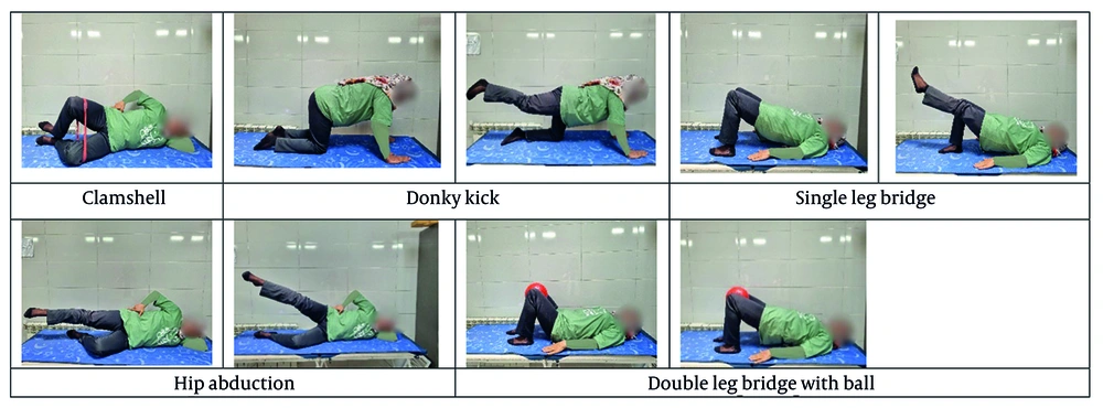 The DNSHS group received, in addition to the standard DNS protocol, a targeted hip-strengthening program consisting of exercises such as Clamshells, Donkey Kicks, and single- and double-leg Bridges. This supplementary training was performed three times per week for eight weeks, with each 30-minute session comprising three sets of 15 repetitions per exercise and 30 - 40 seconds of rest between sets. (Figure 3) (18)