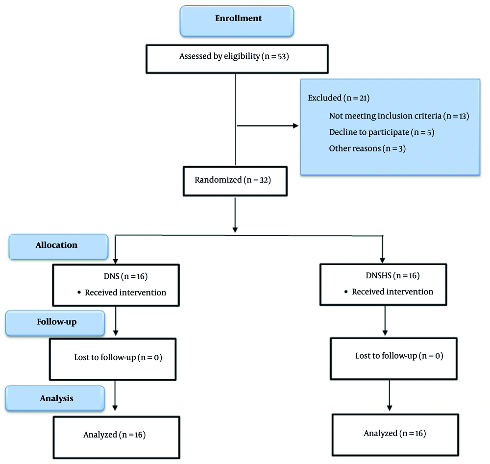 Sample size was calculated using G*Power (v3.1.9.4) based on an expected effect size of 0.307, α = 0.05, and power = 0.80, which yielded a minimum requirement of 24 participants (12 per group). To account for potential dropouts, 32 women were enrolled and randomly allocated to either the DNS or DNSHS group (16 per group).