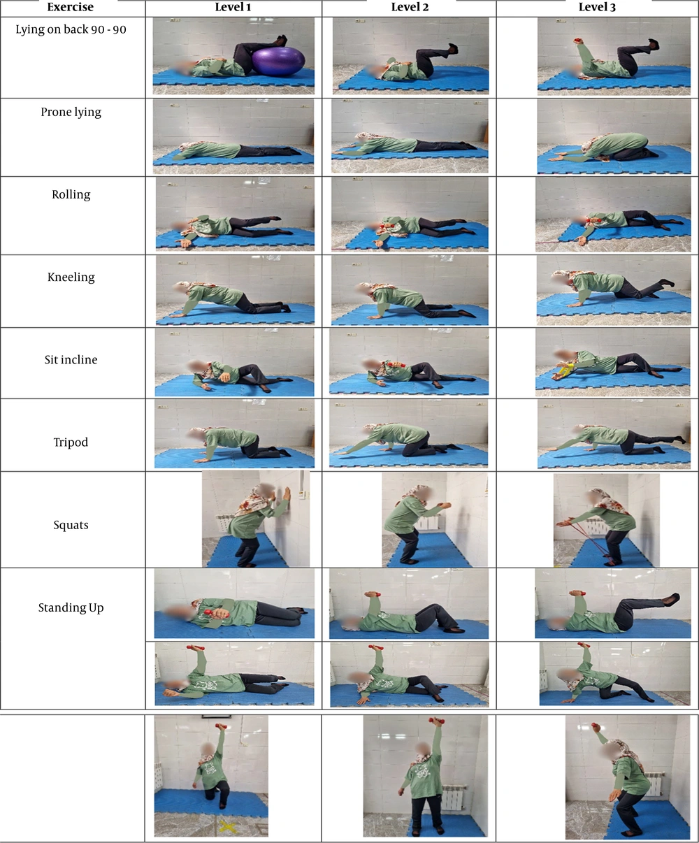Exercise interventions such as dynamic neuromuscular stabilization (DNS) have proven effective in managing CLBP by enhancing core stability and spinal control (8). However, DNS alone may not adequately address gluteal weakness, which is frequently observed in this population. Targeted strengthening of these hip muscles is crucial for restoring pelvic alignment, improving functional stability, and reducing stress on the lumbar spine. Combining DNS with specific gluteal strengthening exercises has been shown to enhance pelvic stability and balance more effectively than DNS alone (9, 10). Strengthening the gluteal muscles also improves dynamic balance, reduces fall risk, and alleviates pain (11). The combined effects of DNS and gluteal exercises in older adults with CLBP remain underexplored. Despite these findings, the combined effects of DNS and gluteal strengthening exercises in older adults with CLBP remain underexplored. To date, no studies have directly compared the efficacy of DNS plus targeted hip-strengthening exercises (DNSHS) versus DNS alone on balance, lower extremity strength, and functional disability. Moreover, this combined intervention has not been specifically investigated in older women with chronic nonspecific low back pain.